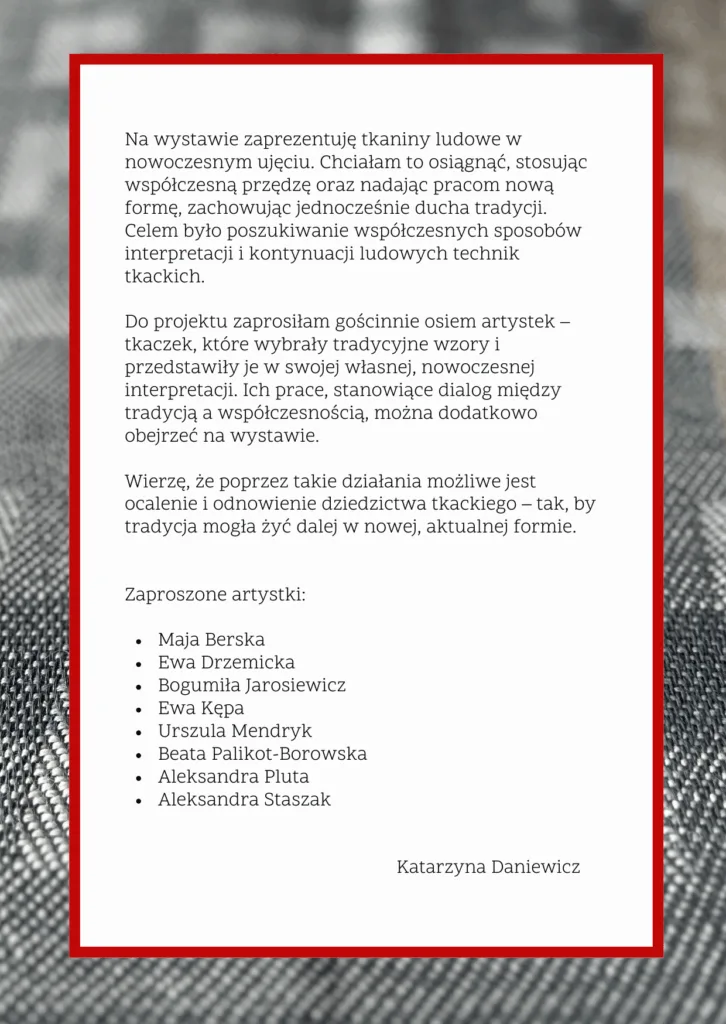 Każda z tkanin została szczegółowo opisana – informacje o materiałach i technikach można znaleźć przy stałej ekspozycji w Centrum Rękodzieła Ludowego w Niemczynie oraz w katalogach online (StrefaTkania.org i Tkamy.pl).